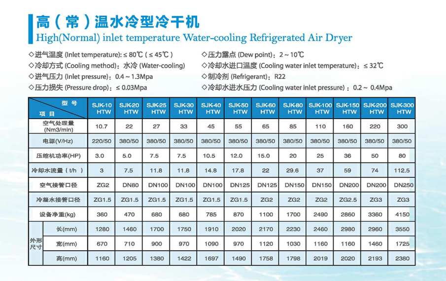 產(chǎn)品描述:冷凍式干燥機(jī)分為風(fēng)冷型,水冷型,處理量從1m3/min到500m3/min,壓力露點(diǎn)2-10℃,電源有220V/380V/440V等.空氣系統(tǒng)有不銹鋼,鋁板換等