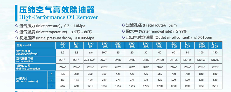 進氣壓力:0.2-1.0Mpa,過濾孔徑5um,除水率大于99%,初始壓降小于0.005Mpa,出口氣體含油量控制在0.01ppm